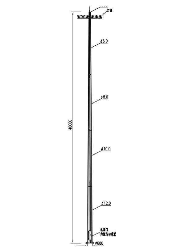 3.高桿燈頂部配設(shè)避雷針,所有連接部件為不銹鋼螺栓負(fù)載能力1000公斤。